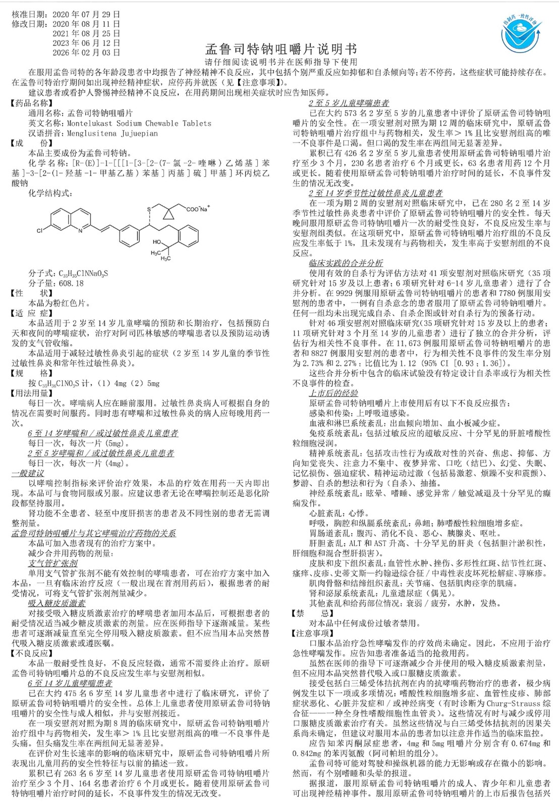 【適應癥】本品適用于2歲至14歲兒童哮喘的預防和長期治療,包括預防白天和夜間的哮喘癥狀,治療對阿司匹林敏感的哮喘患者以及預防運動誘發(fā)的支氣管收縮。